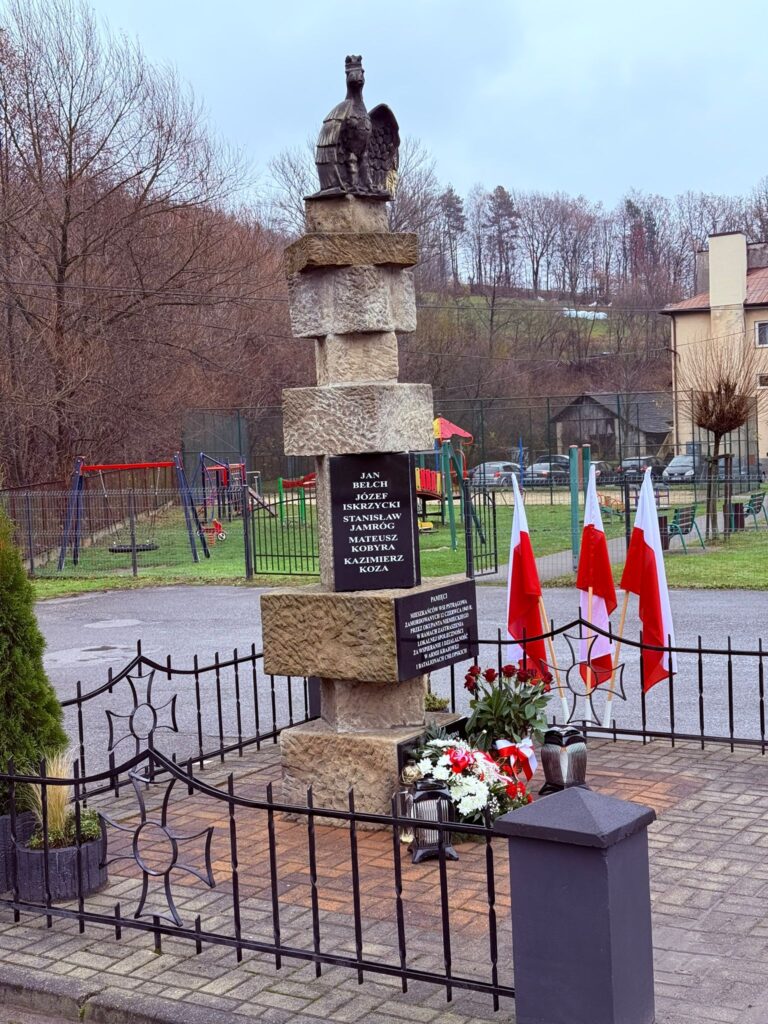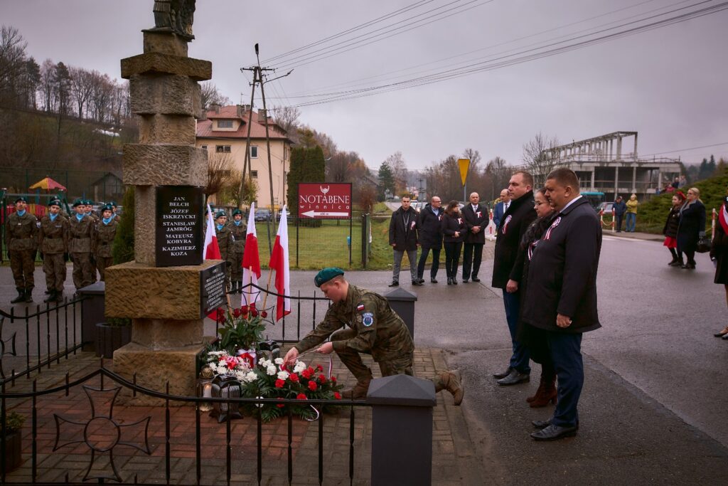 Kolejnym punktem programu Gminnych Obchodów Święta Niepodległości było oddanie hołdu bohaterom, poległym za naszą Ojczyznę, poprzez symboliczną minutę ciszy, pod pomnikiem poświęconym ofiarom pacyfikacji naszej wsi i złożenie kwiatów przez delegacje – gminy, powiatu, strzelców i szkoły.