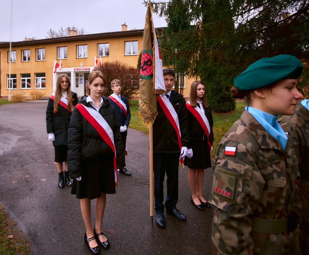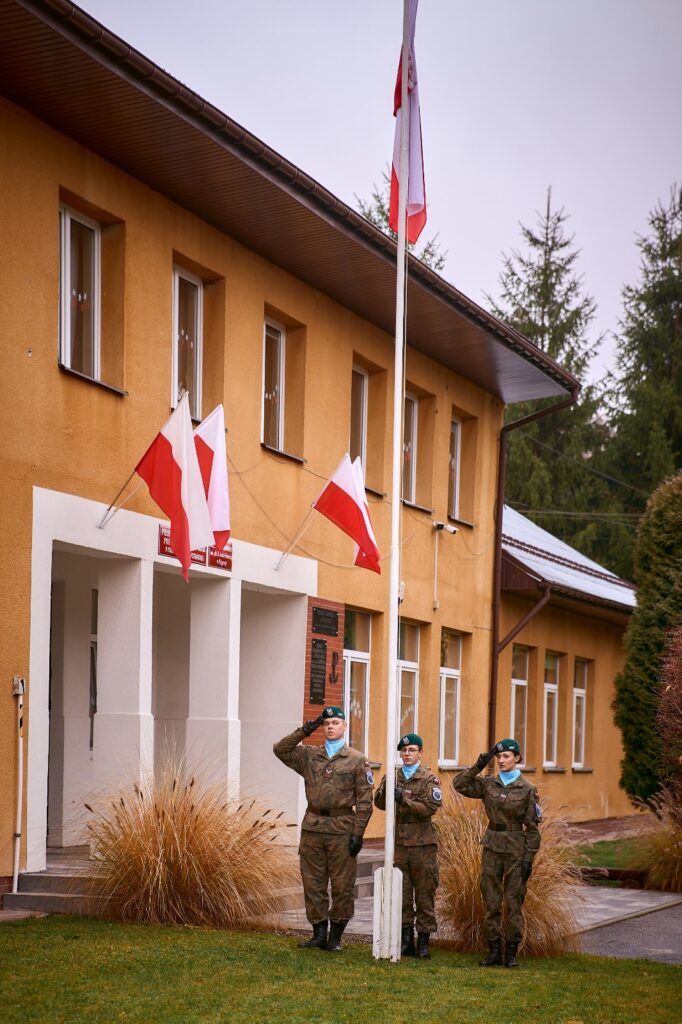 Następnie pod budynkiem szkoły, reprezentacja strzelców wciągnęła flagę na maszt, a my z dumą odśpiewaliśmy nasz hymn narodowy.