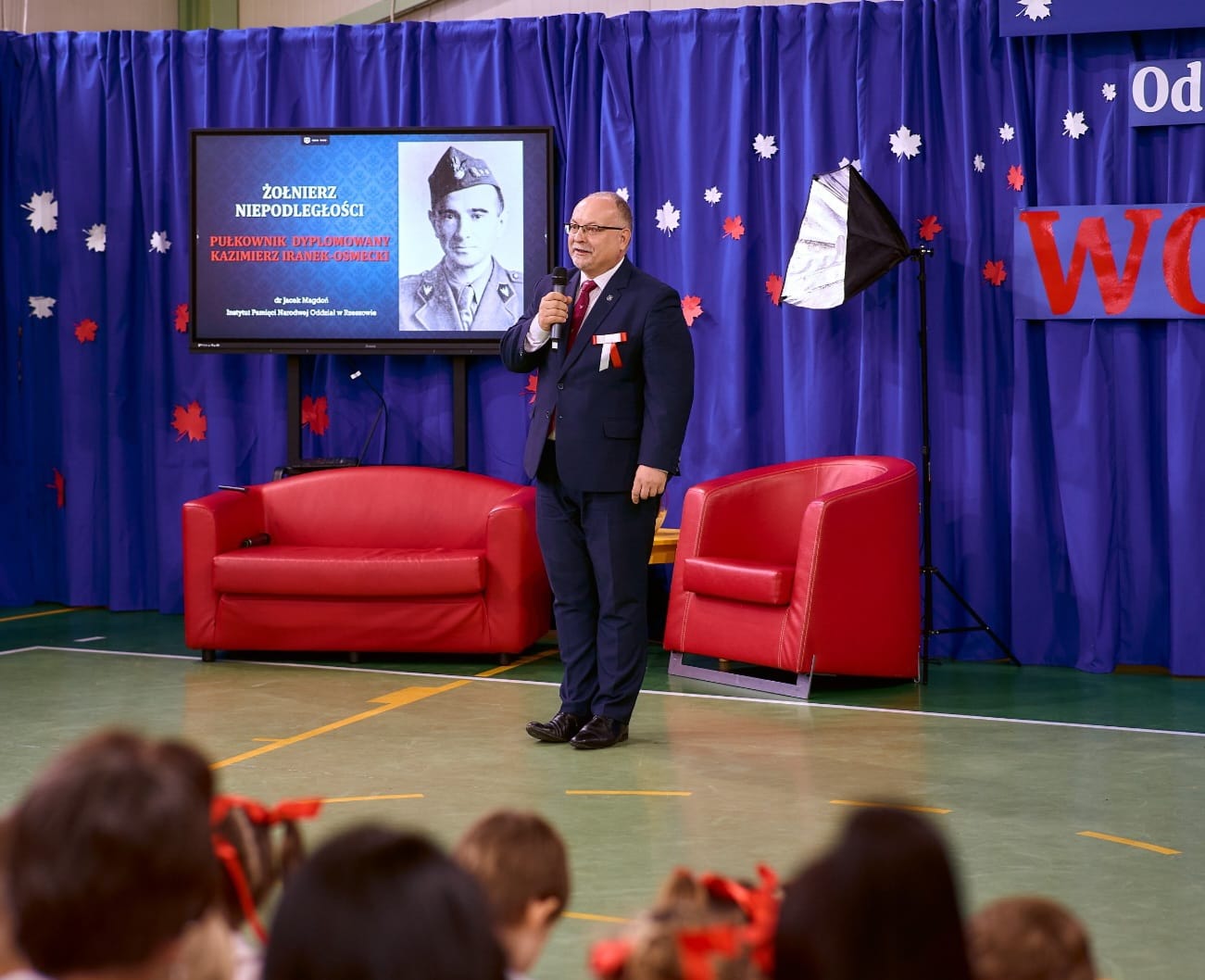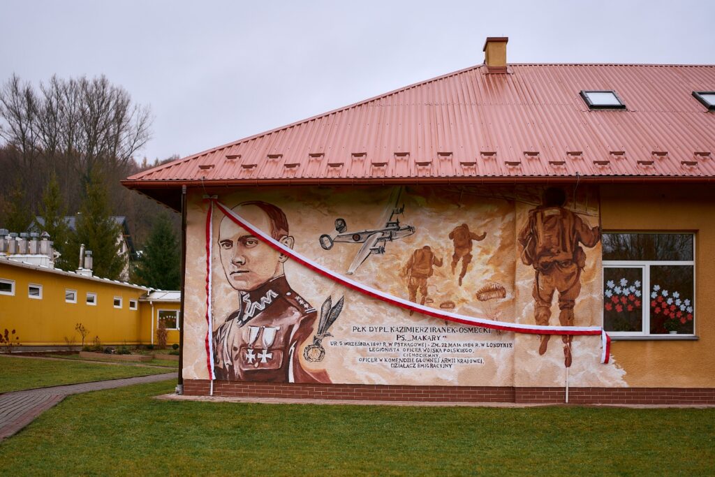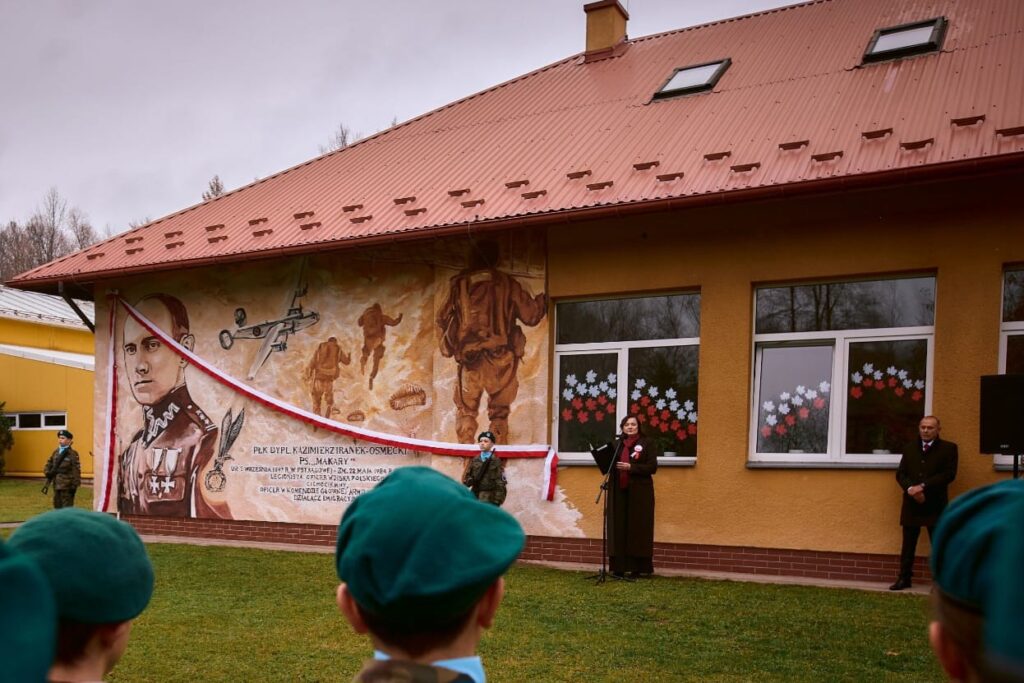 Uczciliśmy nie tylko wielką historię Polski, ale też, w sposób szczególny, człowieka, który urodził się niedaleko szkoły – płk. K. Iranka Osmeckiego. W program uroczystości gminnych wpisana była ceremonia odsłonięcia muralu, dedykowanego właśnie Patronowi szkoły, a powstałego z inicjatywy Pani Dyrektor Edyty Englot – Rybka.