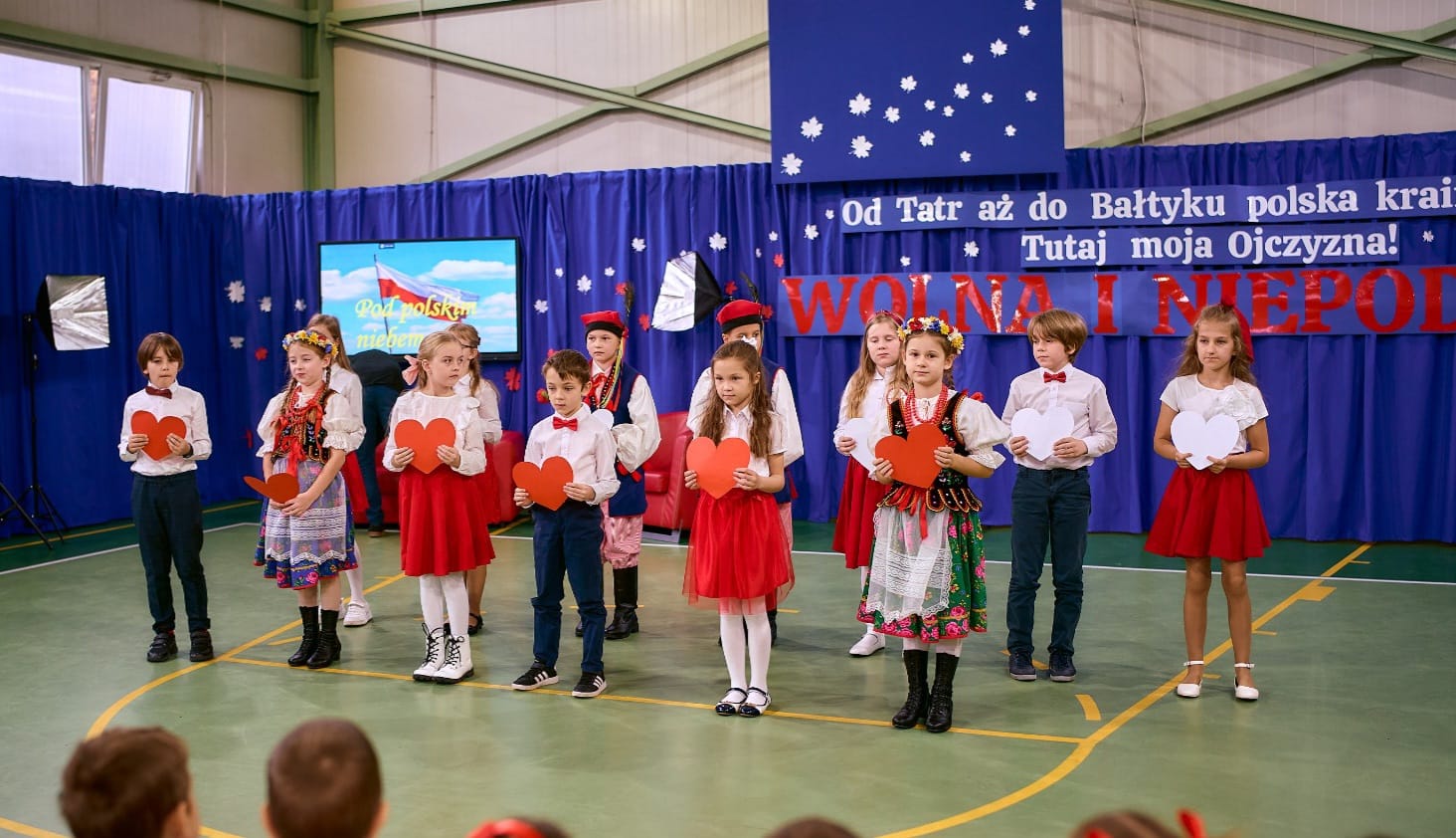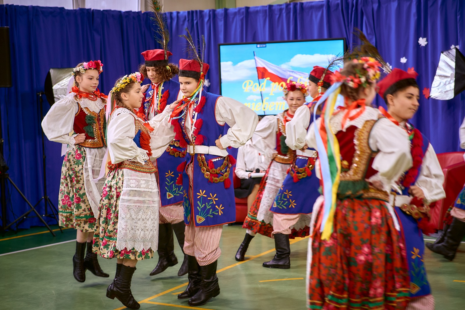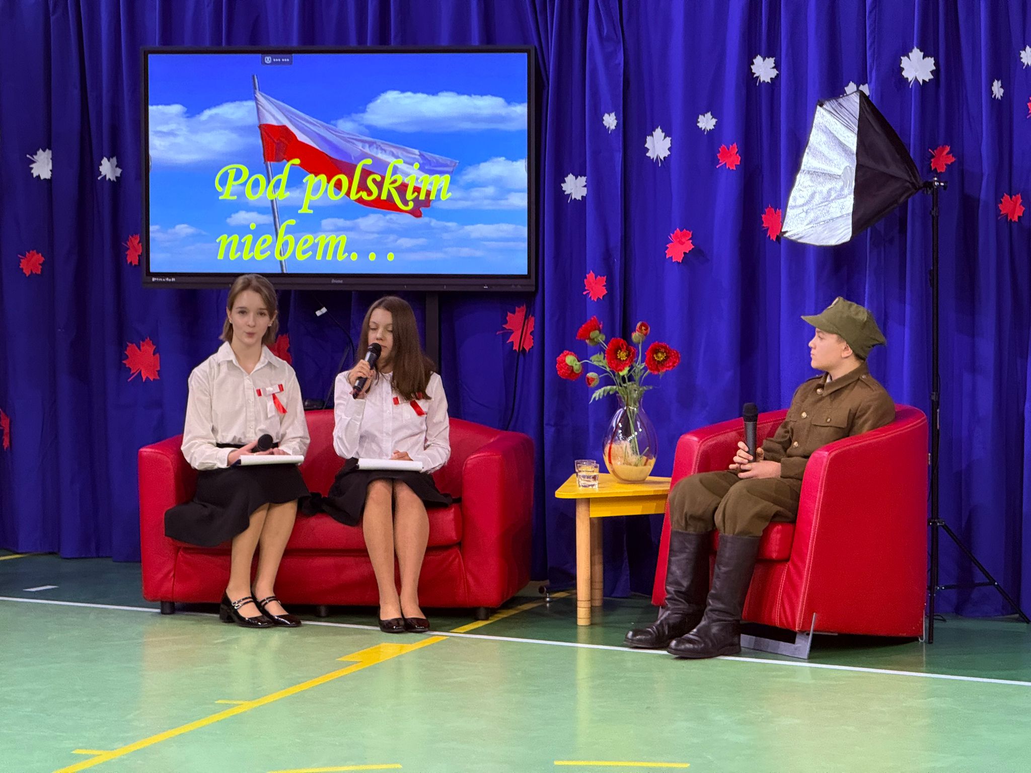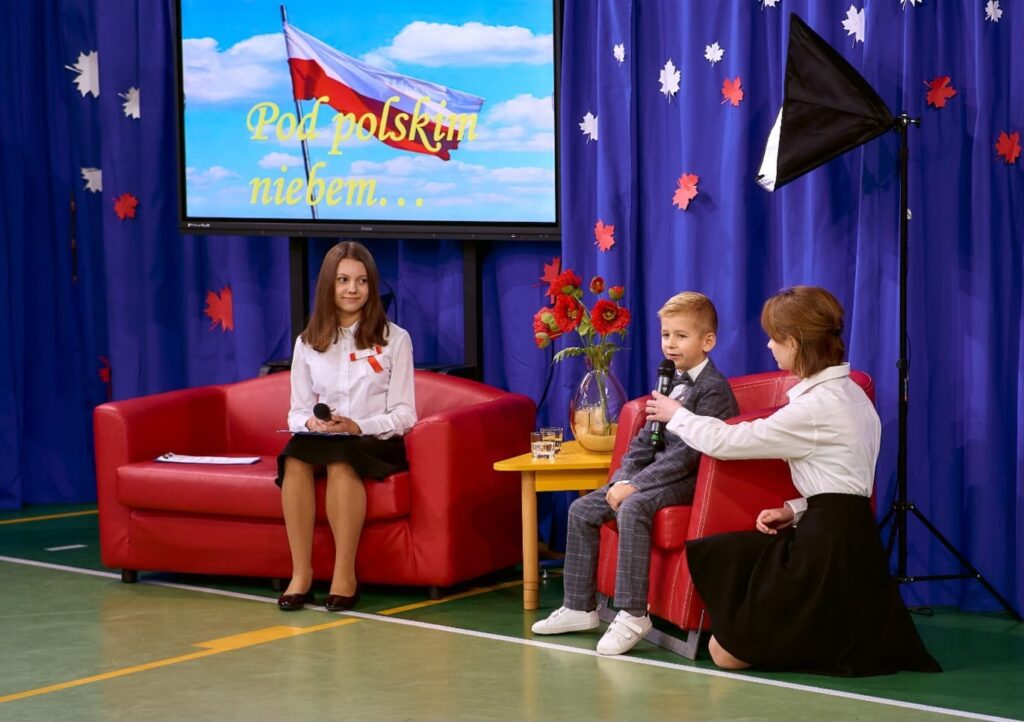 Na koniec uroczystości przedszkolaki i uczniowie przedstawili przygotowany program artystyczny. Dziennikarki – Lidia i Justyna w studio „Pod polskim niebem” rozmawiały z zaproszonymi gośćmi o patriotyźmie. Na czerwonej kanapie pojawili się: przedszkolak-Antoś, płk K. Iranek Osmecki-Mateusz, pani nadleśniczy- Wiktoria oraz goście specjalni: hejnalistka- Karolina, tańczący z flagami – ucz.kl.4 i 5, śpiewający duet – Julia i Oskar, chóry z kl.3 i 5 oraz najlepsi tancerze z kl. 1-8, którzy odtańczyli taniec narodowy – krakowiak.